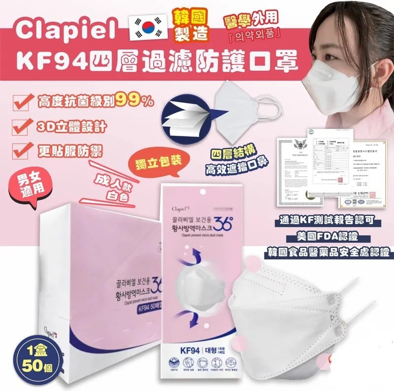 韓國 Clapiel KF94 四層過濾防護口罩成人白色口罩(1盒50個) - TW251114S01 《16/11截單,預計1月中旬到港》