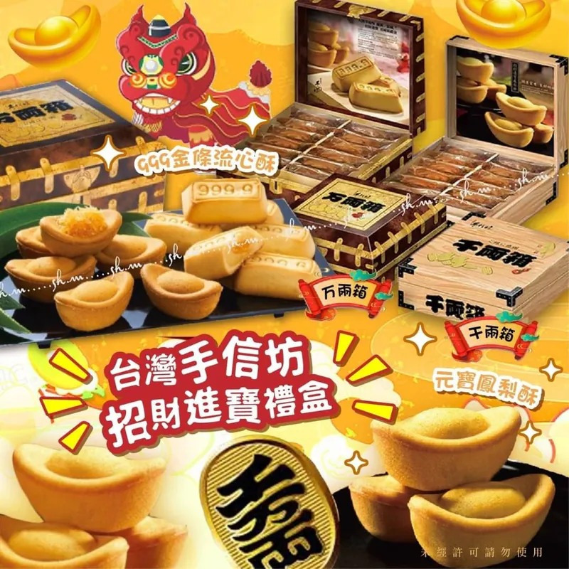 📝 截單日:12月24日 📦 預計到貨日:2月中旬 A.千両箱(招財進寶鳳梨酥12入) B.萬両箱(招財進寶鳳梨酥6入、富貴吉祥流金酥6入) 新年禮盒推介~上年大賣過萬盒! 「招財進寶萬両箱,千両箱禮盒」 一盒12個,二款可愛造型 👀最吸晴的金元寶💰造型鳳梨酥 還有9️⃣9️⃣9️⃣金條造型流金酥 「招財進寶万兩箱禮盒」將🙌贈禮者的💝心意表露得既直白又有滿滿的趣味🤹♀️🤹♂️ ◆金元寶造型鳳酥🍍◆ 真材實料鳳梨鮮果當餡料 😋金黃餅皮,一口咬下 🍍鳳梨甜香滿齒頰 🧧好運自然旺旺來 ◆ 富貴吉祥流金酥🥚◆ 「以餡做皮」、「餡皮包餡」的傳統日式桃山派做法 😋一口品嚐,皮餡口感細緻滑潤 😚自能體會「奶黃濃香餡流漿」的境界。 -產地:台灣 -規格:1盒12入 -保存期限:出廠後90天(到港日尚約60-80天) -保存方式:避免陽光直射,請置於陰涼乾燥。 -過敏原資訊:本產品含麩質之穀物、牛奶、蛋、大豆及其製品,不適合其過敏體質食用 ⭕️ 顏色或因拍攝器材或顯示螢幕等因素而與實物有異,以上圖片及文字僅供參考,一切以實物為準 ⭕️ 以上資料及外盒包裝只供參考,商品外盒原廠有更換新包裝權利,一切以實物為準。 ⚠️聲明 ⚠️ 1. 本貨品為平行進口正貨。 2. 帖文內容及外盒包裝圖片,只供參考用途,商品原廠有更換新包裝之權利,一切以貨品實物為準。 3. 本公司並沒持有任何品牌之版權,所有商標或版權均屬有關商品品牌商標的持有人,圖片及資料轉載只作分享用途,敬請留意。 4. 貨品在運輸過程中,或會導產品 *包裝外盒損毀凹陷* 及 *產品出現輕微瑕疵*,在不影響產品本身食用/使用,供應商不會作任何更換或退款,購買前請慎重考慮。