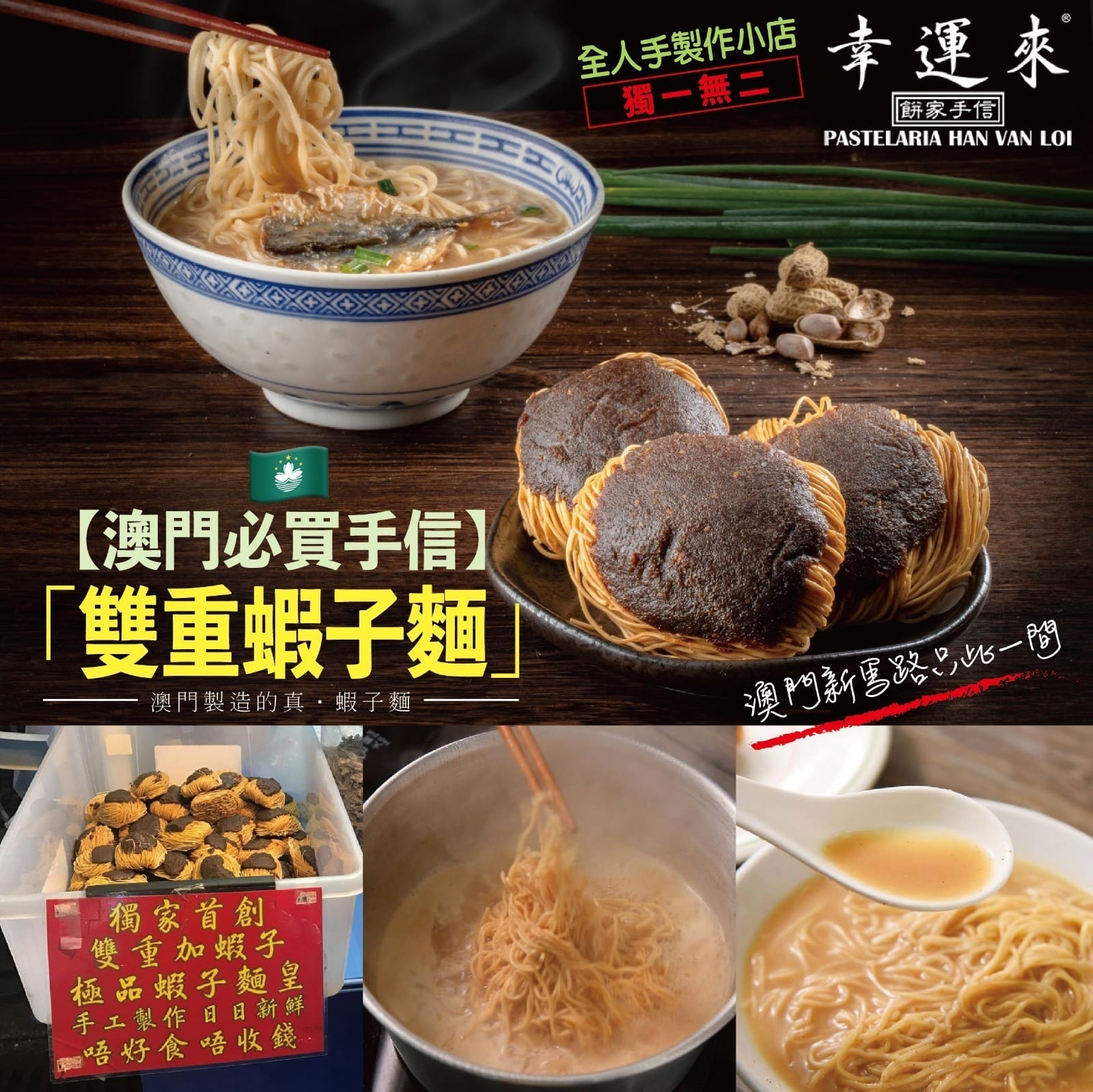 📝 截單日:售完即止 📦 預計到貨日:10月中下旬 好耐無開團喇🩷🩷🩷 好多客人問幾時返😉 全人手製作小店🇲🇴幸運來手信 澳門新馬路只此一間 【澳門必買手信】「雙重蝦子麵」 雙重蝦子麵 1 袋9 個麵底 全人手製作 ( 數量有限,售完即止) 老闆獨創雙重蝦子麵🦐獨一無二 對自己滿有信心💪🏼揚言唔好食唔收錢 在地深度小店手信🥰超吸引專程去買 澳門製造的真‧蝦子麵,呢個蝦子麵餅面黐滿來自緬甸大頭蝦蝦子,淨係拎起個麵餅,就已經聞到強烈的蝦子味,未食已經好肯定超正! 好食買超多😎有客一買就買500個 全手工製超有誠意😊非機器大量生產 同一般蝦子麵唔同😍幸運來獨有雙重 搓麵加入蝦子👀麵餅表面再鋪一層蝦子 冇落鹼水❌唔會有怪味影響味道 只用緬甸大頭蝦子+大地魚湯搓成🇲🇲 面層蝦子形成濃厚鮮蝦子湯底🤤 湯濃麵爽🍜無油膩感天然鹹鮮滋味 🔻濃湯吃用法🔻 380毫升清水煲滾 放麵餅煮2分鐘 用筷子撥散再煮1分鐘 煮麵水就會變成精華濃湯 保質期三個月(放雪櫃建議可放半年) ⚠️聲明 ⚠️ 1. 本貨品為平行進口正貨。 2. 帖文內容及外盒包裝圖片,只供參考用途,商品原廠有更換新包裝之權利,一切以貨品實物為準。 3. 本公司並沒持有任何品牌之版權,所有商標或版權均屬有關商品品牌商標的持有人,圖片及資料轉載只作分享用途,敬請留意。 4. 貨品在運輸過程中,或會導產品 *包裝外盒損毀凹陷* 及 *產品出現輕微瑕疵*,在不影響產品本身食用/使用,供應商不會作任何更換或退款,購買前請慎重考慮。