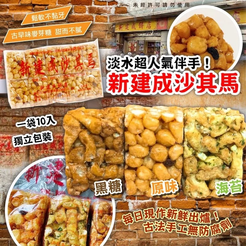 📝 截單日:10月6日 📦 預計到貨日:11月中旬 口味: A. 黑糖 B. 原味 C. 海苔 馬仔唔會係你嘅童年回憶呢😍 🥨台灣淡水老街名產-新建成沙琪瑪 比香港嘅大件頭,差不多大一倍,9.5*5*5cm 而新建成的還是有帶點脆度😋 淡水呢間真係冇得彈,食過返尋味😁咬起來鬆軟麥芽糖不黏牙 一到假日就好快賣完了!!都要提早去排隊購買才買得到唷 新建成沙琪瑪跟以前吃過完完全全不一樣!快點試試看喔~😋😋😋 -產地:台灣 -規格:500g±10g(1袋10入) -保存期限:生產日起計60天(商品銷售速度快,依實際出廠為主。) -保存方式:避免陽光直射,請置於陰涼乾燥。 -過敏原資訊:本產品含麩質之穀物、牛奶、蛋、大豆及其製品,不適合其過敏體質食用 ⭕️ 顏色或因拍攝器材或顯示螢幕等因素而與實物有異,以上圖片及文字僅供參考,一切以實物為準 ⭕️ 以上資料及外盒包裝只供參考,商品外盒原廠有更換新包裝權利,一切以實物為準。 ⚠️聲明 ⚠️ 1. 本貨品為平行進口正貨。 2. 帖文內容及外盒包裝圖片,只供參考用途,商品原廠有更換新包裝之權利,一切以貨品實物為準。 3. 本公司並沒持有任何品牌之版權,所有商標或版權均屬有關商品品牌商標的持有人,圖片及資料轉載只作分享用途,敬請留意。 4. 貨品在運輸過程中,或會導產品 *包裝外盒損毀凹陷* 及 *產品出現輕微瑕疵*,在不影響產品本身食用/使用,供應商不會作任何更換或退款,購買前請慎重考慮。