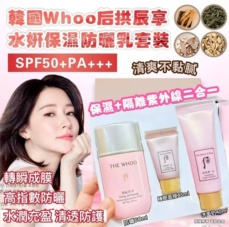 📝 截單日:12月9日 📦 預計到貨日:1月中旬 懶人恩物💁♀️ WHOO防曬乳 一支搞掂妝前+防曬+保濕🤩低至$11x/套❗勁抵,只限呢批😱 踏入春季⛱🌞☀️又要同陽光玩遊戲😂😊準備功夫一定要做足。韓國頂級品牌WHOO后 早就準備咗。 ✅清氣益壽精萃:富含珍貴成分,提供肌膚不老能量 ✅調律精萃:幫助循環,使肌膚水嫩健康 ✅瓊玉精萃:營養濃度高的保濕成分,從肌膚底層開始保濕 ✅銀離子淨化水:讓肌膚飲到最純淨的水 💦水妍系列最適合肌膚外油內乾嘅肌膚使用,當肌膚缺水就會容易出油,只要能深層保濕就能解決油光,達到水油平衡,肌膚自然健康水透亮,抗老化,保濕抗氧化咗。 質地乳霜狀容易被皮膚吸收,非常水潤 ❤Whoo 后拱辰享水妍保濕防曬乳套裝 套裝包括: 1️⃣水妍潔面泡沫 40ml 2️⃣2️水妍睡眠面膜13ml 3️⃣防曬霜60ml -產地:韓國 -規格: 水妍潔面泡沫 40ml x 1 水妍睡眠面膜 13ml x 1 防曬霜 60ml x 1 -保存期限:2027年07月17日 -保存方式:避免陽光直射,請置於陰涼乾燥。 -注意事項: ※請確保將產品放在孩童和寵物接觸不到的地方。 ※使用後如有不適,請暫停使用並諮詢專業醫師。 ※如不小心噴到眼睛,請用清水沖洗10-15分鐘後,請立即就醫諮詢專業醫師。 ⭕️ 顏色或因拍攝器材或顯示螢幕等因素而與實物有異,以上圖片及文字僅供參考,一切以實物為準 ⭕️ 以上資料及外盒包裝只供參考,商品外盒原廠有更換新包裝權利,一切以實物為準。 ⚠️聲明 ⚠️ 1. 本貨品為平行進口正貨。 2. 帖文內容及外盒包裝圖片,只供參考用途,商品原廠有更換新包裝之權利,一切以貨品實物為準。 3. 本公司並沒持有任何品牌之版權,所有商標或版權均屬有關商品品牌商標的持有人,圖片及資料轉載只作分享用途,敬請留意。 4. 貨品在運輸過程中,或會導產品 *包裝外盒損毀凹陷* 及 *產品出現輕微瑕疵*,在不影響產品本身食用/使用,供應商不會作任何更換或退款,購買前請慎重考慮。