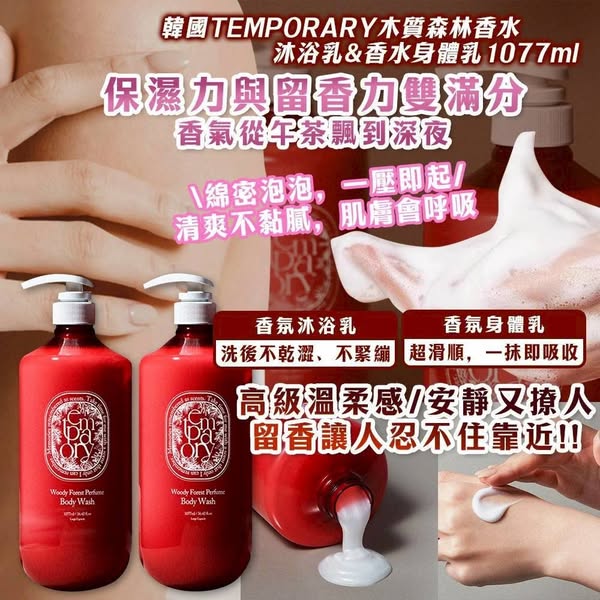 📝 截單日:10月18日 📦 預計到貨日:11月下旬 👇🏻👇🏻配埋佢個木質沐浴露~Perfect❤️❤️👇🏻👇🏻 🌸韓國Temporary木質森林香水沐浴乳1077ml 【🧼洗完香一整天✨】 🌲**#Temporary 森林系沐浴乳 登場!**🌲 洗一次=走進香氛森林浴,舒服到快融化🌿 🌿前調是清爽柑橘, 🌿中調轉進溫柔的雪松和琥珀, 🌿最後收在溫暖的白麝香和木質香~ 整個人乾淨又迷人,香氣比洗完澡還療癒💚 ✔ 超綿密泡泡 ✨ ✔ 洗完不乾澀、不緊繃 ✔ 像在高級飯店洗澡的感覺🛁 ✔ 男女都超適合,洗出戀愛體香🧡 💬有用過的人都說:「這香味太誇張…超像在泡森林SPA!」 #洗香香 #香味洗出好感度 💯 -規格:1077ML -保存期限:生產日起計年(商品銷售速度快,依實際出廠為主。) -保存方式:避免陽光直射,請置於陰涼乾燥。 ⭕️ 顏色或因拍攝器材或顯示螢幕等因素而與實物有異,以上圖片及文字僅供參考,一切以實物為準 ⭕️ 以上資料及外盒包裝只供參考,商品外盒原廠有更換新包裝權利,一切以實物為準。 ⚠️聲明 ⚠️ 1. 本貨品為平行進口正貨。 2. 帖文內容及外盒包裝圖片,只供參考用途,商品原廠有更換新包裝之權利,一切以貨品實物為準。 3. 本公司並沒持有任何品牌之版權,所有商標或版權均屬有關商品品牌商標的持有人,圖片及資料轉載只作分享用途,敬請留意。 4. 貨品在運輸過程中,或會導產品 *包裝外盒損毀凹陷* 及 *產品出現輕微瑕疵*,在不影響產品本身食用/使用,供應商不會作任何更換或退款,購買前請慎重考慮。